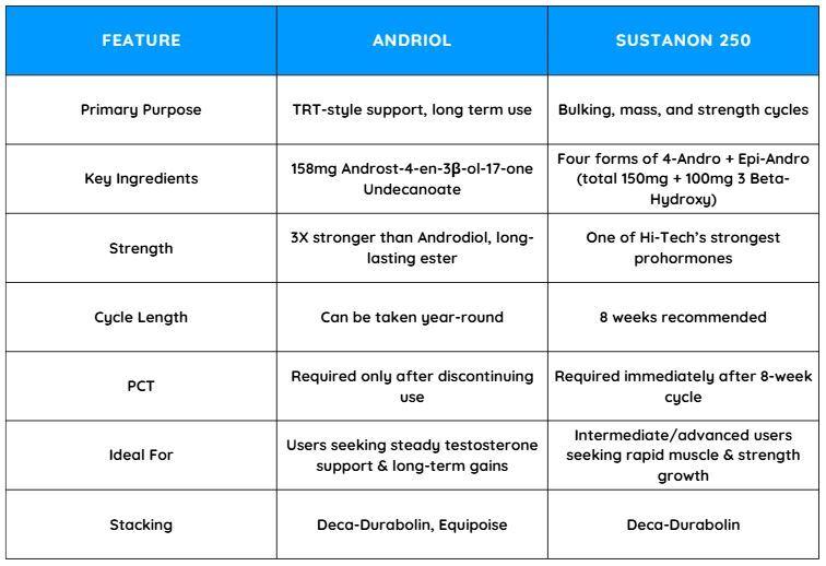 When it comes to prohormones, two popular options from Hi-Tech Pharmaceuticals are Andriol and Sustanon 250. While both are powerful, they serve different purposes. Andriol is designed as a year-round testosterone replenishment option, while Sustanon 250 is a stronger prohormone formulated for shorter bulking cycles. In this blog post, we'll break down the key differences, benefits, and uses of Andriol vs Sustanon 250 so you can better understand which one aligns with your fitness goals.