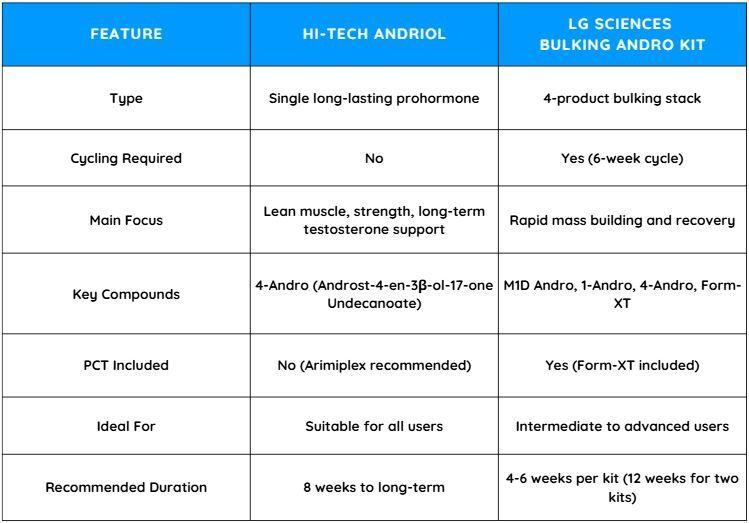 Hi-Tech Andriol vs LG Sciences Bulking Andro Kit: Comparison Chart