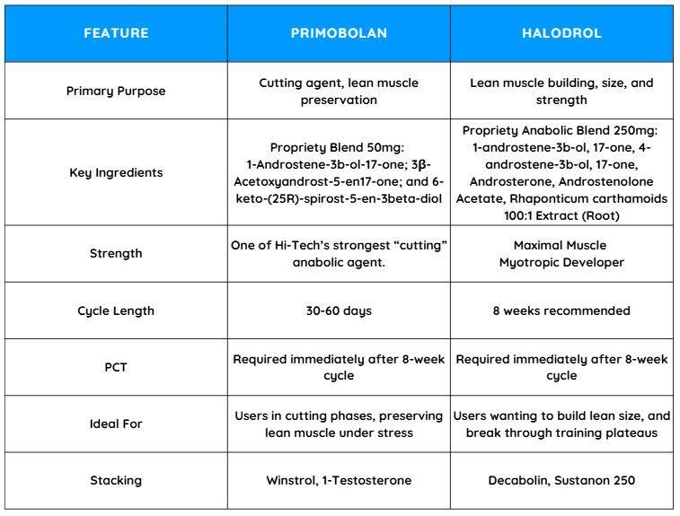 Both are powerful prohormones from Hi-Tech Pharmaceuticals, but the choice ultimately depends on whether you're prioritizing cutting and preservation (Primobolan) or size and strength (Halodrol).